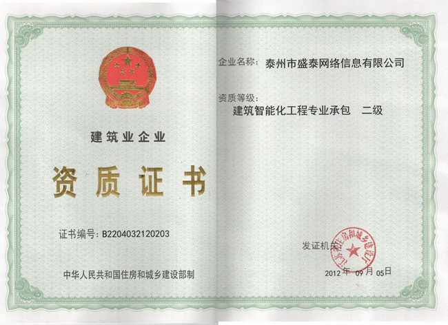 熱烈慶祝泰州市盛泰網(wǎng)絡(luò)信息有限公司建筑智能化專業(yè)承包資質(zhì)(二級(jí))申請(qǐng)并獲得通過。這標(biāo)志著我公司未來將在建筑智能化領(lǐng)域邁開嶄新的一步!同時(shí)也預(yù)祝公司在未來有更大更快更好的發(fā)展!...